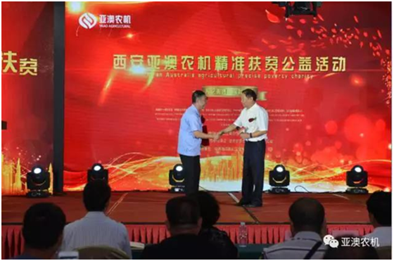亞澳精準(zhǔn)扶貧公益活動(dòng)現(xiàn)場(chǎng),中國(guó)農(nóng)機(jī)化協(xié)會(huì)會(huì)長(zhǎng)劉憲到會(huì)致辭,并給予亞澳頒發(fā)證書(shū)。